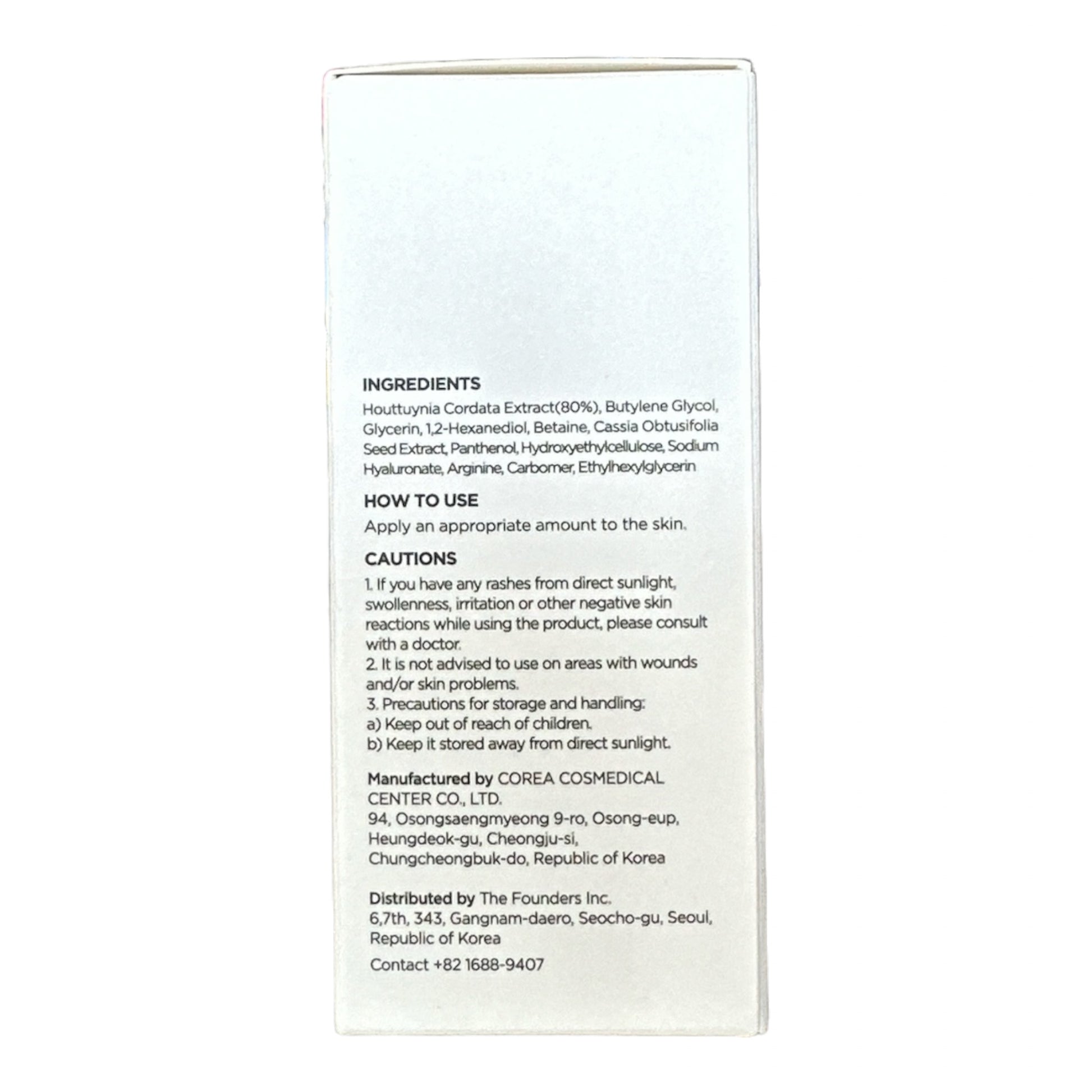 Houttuynia Cordata Extract, Butylene Glycol, Glycerin, 1,2-Hexanediol, Betaine, Cassia Obtusifolia Seed Extract, Panthenol, Hydroxyethyl Cellulose, Sodium Hyaluronate, Arginine, Carbomer, Ethylhexylglycerin.